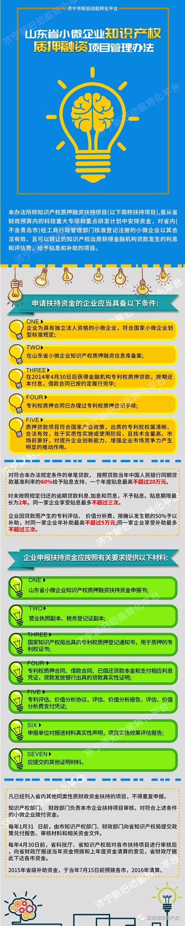 本辦法為推動(dòng)大眾創(chuàng)業(yè)、萬(wàn)眾創(chuàng)新,支持小微企業(yè)發(fā)展,提高財(cái)政資金使用效益,更好的發(fā)揮財(cái)政資金引導(dǎo)作用而特制。本辦法所稱知識(shí)產(chǎn)權(quán)質(zhì)押融資扶持項(xiàng)目(以下簡(jiǎn)稱扶持項(xiàng)目),是從省財(cái)政預(yù)算內(nèi)的科技重大專項(xiàng)和重點(diǎn)研發(fā)計(jì)劃中安排資金,對(duì)省內(nèi)(不含青島市)經(jīng)工商行政管理部門核準(zhǔn)登記注冊(cè)的小微企業(yè)以其合法有效、且可以轉(zhuǎn)讓的知識(shí)產(chǎn)權(quán)出質(zhì)獲得金融機(jī)構(gòu)貸款發(fā)生的利息和評(píng)估費(fèi),給予貼息和補(bǔ)助的項(xiàng)目。