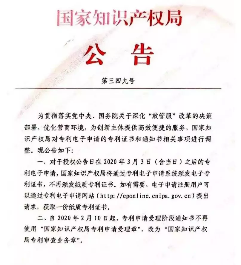 近日,國家知識產(chǎn)權(quán)局發(fā)布的第三四九號公告,對專利電子申請的專利證書和通知書相關(guān)事項進(jìn)行調(diào)整,公告如下: