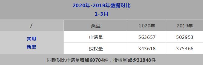 1-3 月,我國實用新型專利申請 56.4 萬件,實用新型專利授權(quán) 34.4 萬件。截至 2020 年 3 月底,實用新型專利有效 量為 545.2 萬件。